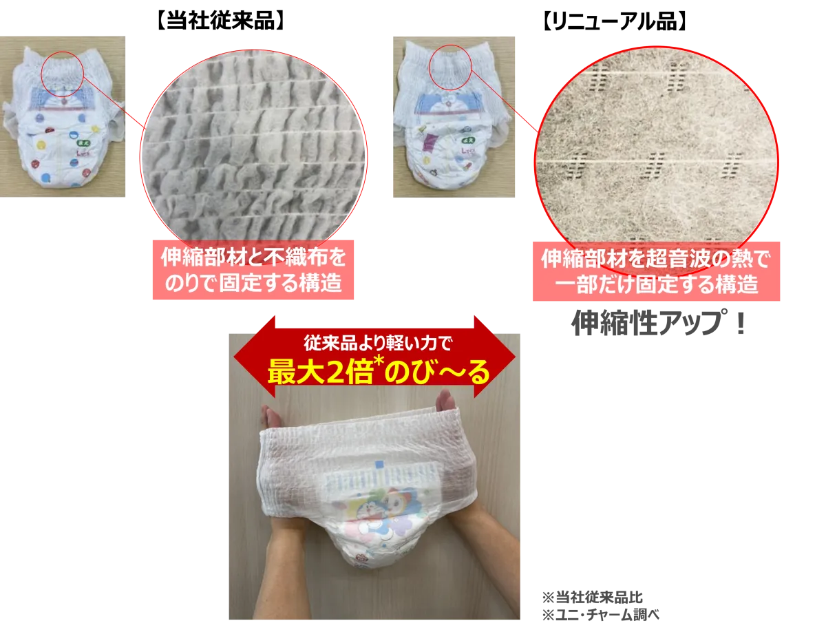 この新技術は、ウエスト部分の伸縮性とフィット性を向上させるために開発されました。具体的には、伸縮部材を超音波で固定することで、従来の接着剤を使用する方法に比べて、より自然な伸縮性を引き出し、最大2倍の伸びを実現しました。これは、お子さまが動いてもズレにくく、軽い力で大きく伸びるため、快適に過ごせる設計になっています。
