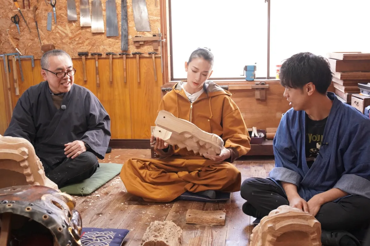 冨永さんが工房に足を踏み入れると、数多くの獅子頭に目を奪われます。彼女が特に驚いたのは、獅子頭は一本の丸太から作られるという点です。木材の中でも特に桐が用いられますが、近年では桐を扱う材木店が少なく、製作が難しくなっている現状を知ります。大芽さんと共に丸太から獅子頭を形作る「荒彫り」の作業に挑戦する冨永さん。湿った状態の桐を彫る感触に楽しさを覚えつつも、乾燥してしまった桐を彫る難しさに直面します。「これ、全然無理!」と叫ぶ彼女に、大芽さんが「テクニックが必要です」と笑顔で応じる一幕も。