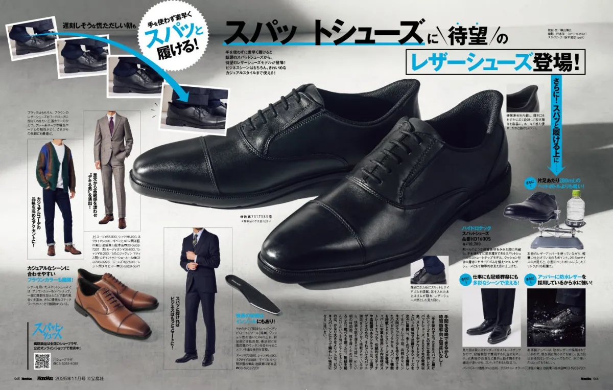 この待望のシューズは、宝島社のモノ・トレンド情報誌「MonoMax」にも特集として掲載され、多くの注目を集めています。ビジネスシーンだけでなく、カジュアルな場面でも活躍する一足として、デザインや機能性が評価されています。