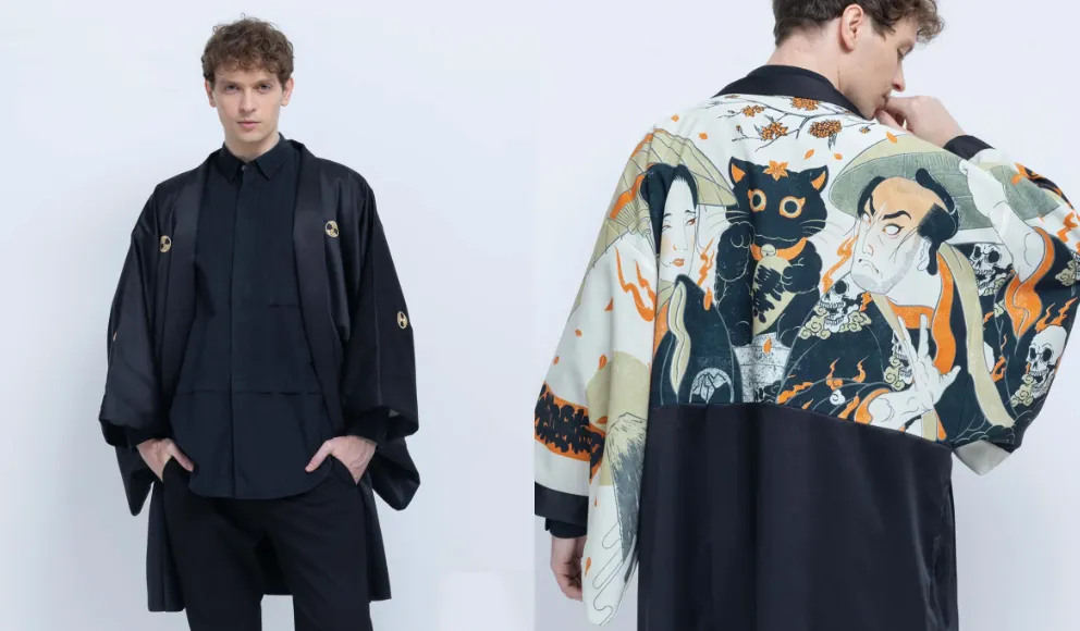 この羽織は、黒紋付羽織の伝統に現代的なアレンジを加えたものです。洗濯可能な素材を使用し、機能性と伝統的な美しさを両立しています。特に注目すべきは、現代浮世絵師・壱楽が特別に描き下ろした作品「東京 Tokyo」が羽裏に大胆にデザインされている点です。この作品は、桜の咲く江戸の町を訪れた侍と女性の心を描いたもので、現代と伝統の融合を象徴しています。
