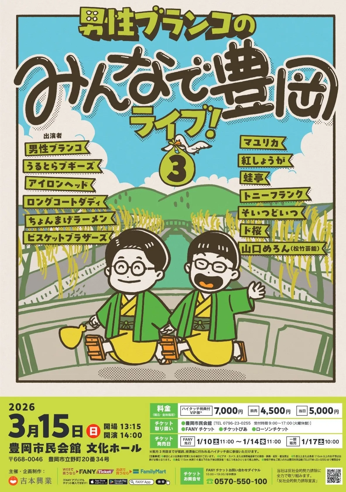 2026年3月15日(日)、兵庫県豊岡市にて、人気コンビ男性ブランコの凱旋ライブ「男性ブランコのみんなで豊岡ライブ!3」が開催されます。このイベントは、地元・豊岡市での開催を重視し、男性ブランコの仲間たちが集結して行われるものです。今年で3回目を迎え、これまでの公演は毎年完売するほどの人気を誇ります。