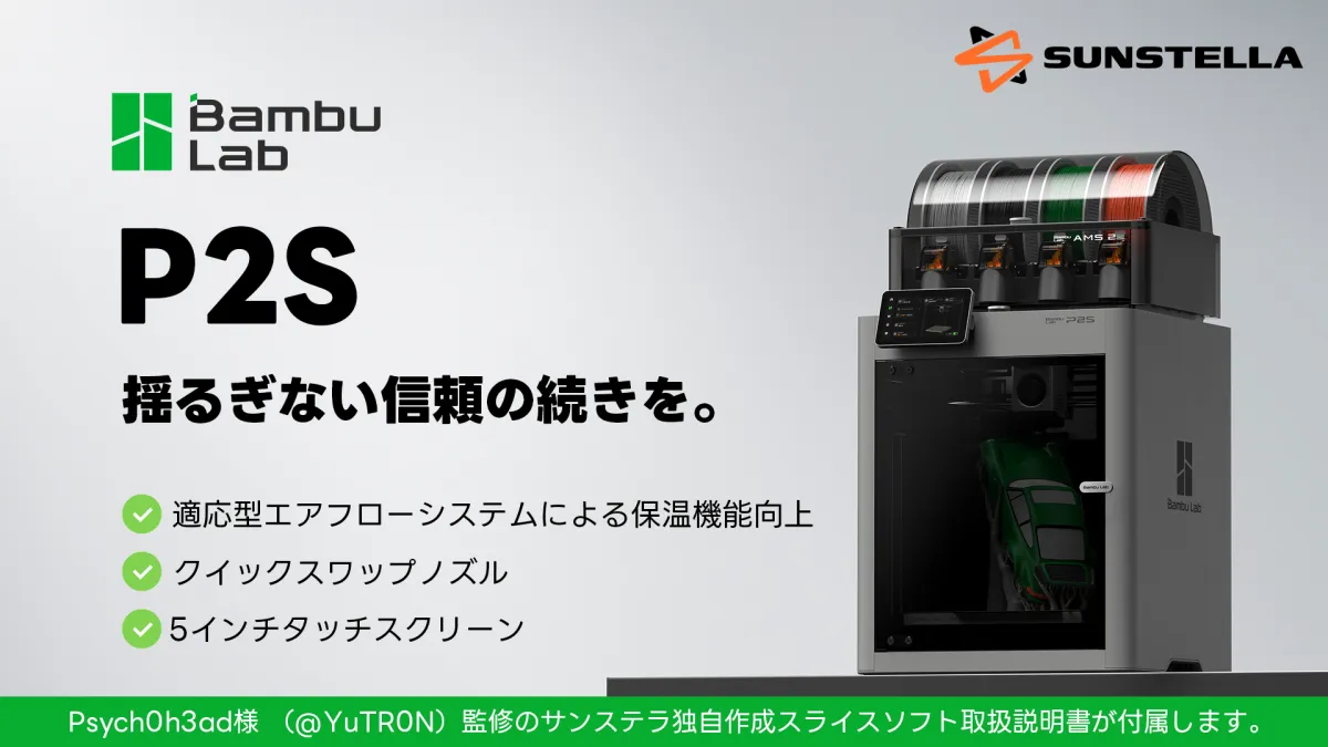 株式会社サンステラの新しいP2S 3Dプリンターは、驚異的な性能と信頼性を持ち、次世代の3Dプリント体験を提供します。専用の取扱説明書が付属しているので、初心者でも安心して導入できるのが大きな魅力です。興味のある方は、ぜひ公式サイトで詳細をチェックしてみてください。