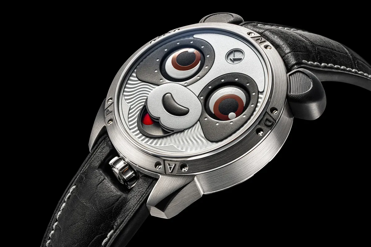 チャイキンのリストモンシリーズには常にユーモアが含まれていますが、「Panda」もその例外ではありません。ジョーカー・インディケーションが搭載され、目から時分を表示するユニークなデザインが魅力です。口元にはムーンフェイズが配置され、全体的に遊び心と独創性に富んだ意匠が施されています。ベゼルには「PANDA」の文字が刻印され、上部ラグにはブラックカーボン複合材が使われ、デザイン性を高めています。
