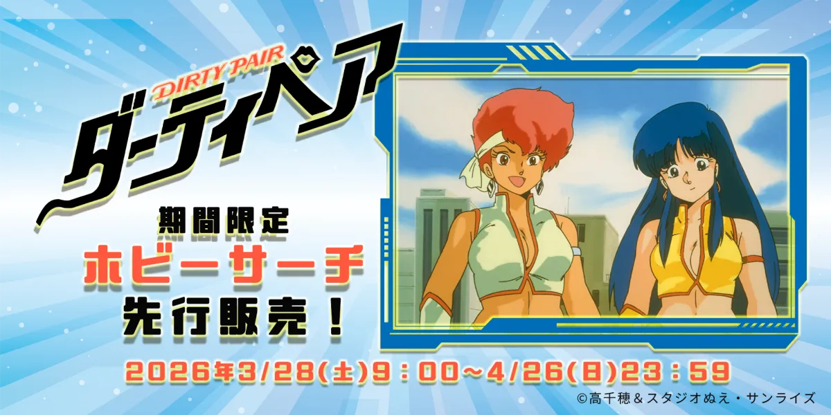 2026年3月28日より、株式会社ホビーサーチがTVアニメ『ダーティペア』新商品を期間限定で先行販売することをお知らせします。これに合わせて、40周年記念展でのグッズも復活します。
