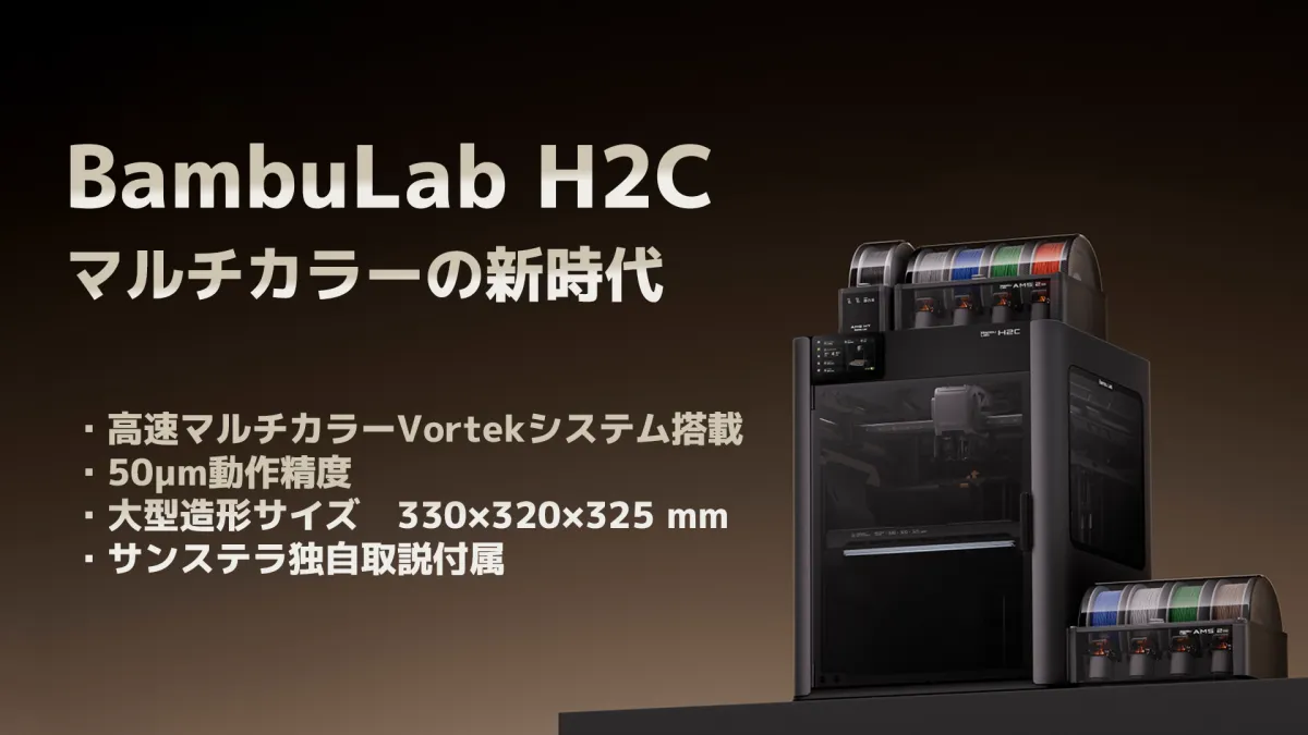 株式会社サンステラが、BambuLabの最新FDM 3Dプリンター「H2C」を日本市場で取り扱い開始しました。この新モデルは、従来の多色印刷の課題を解消し、あらゆるニーズに対応できる革新的なデザインを採用しています。特に注目すべきは、Vortekホットエンド交換システムによって実現された高速なマルチカラー・マルチマテリアル造形です。