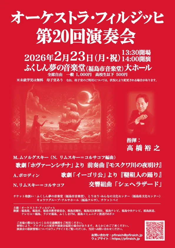 2026年2月23日、福島市音楽堂のふくしん夢の音楽堂において、オーケストラ・フィルジッヒの第20回演奏会が開催されます。この演奏会では、著名な作曲家たちによる名曲が披露されます。開演は14時ですが、13時30分からの会場にぜひお越しください。