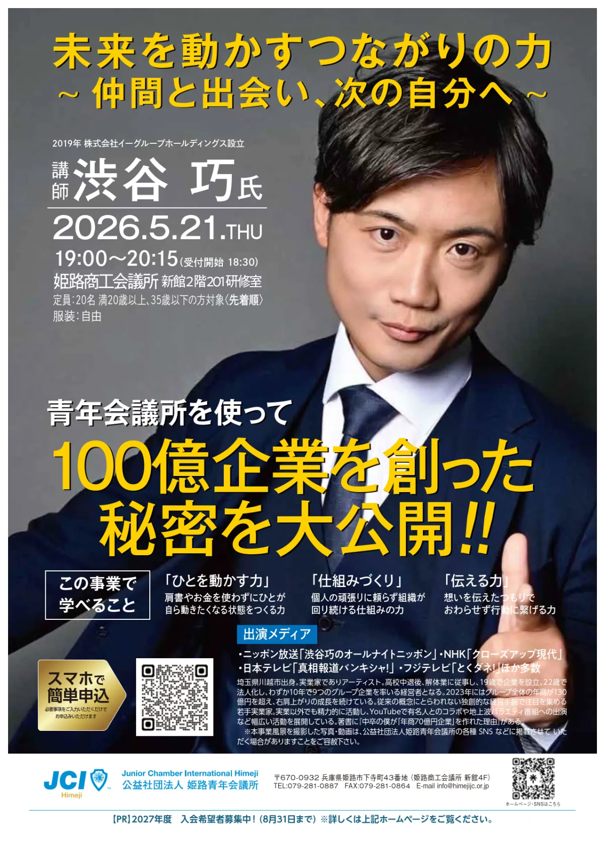 公益社団法人姫路青年会議所が2026年5月21日、姫路商工会議所で興味深いセミナー『未来を動かすつながりの力~仲間と出会い、次の自分へ~』を行います。このイベントでは、渋谷巧氏が講師として登壇し、これからの時代に不可欠なスキルを学ぶ機会が設けられています。