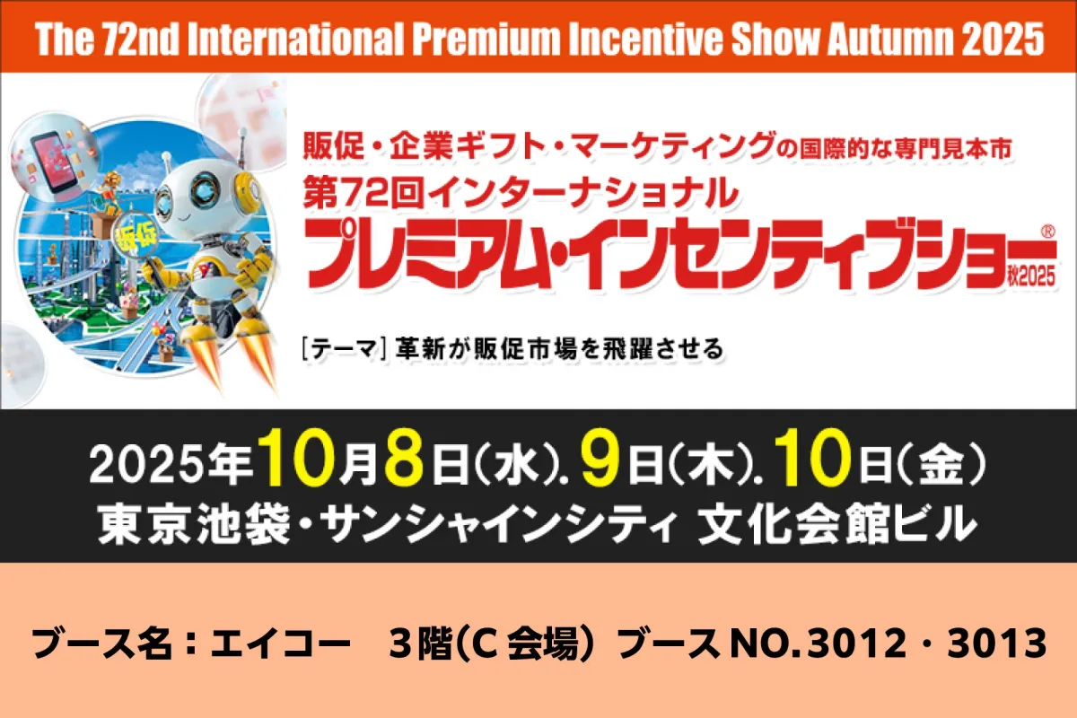 株式会社エイコーが、「第72回インターナショナルプレミアム・インセンティブショー秋2025」に参加します。開催日は2025年の10月8日(水)から10月10日(金)までの三日間。会場は、東京池袋の