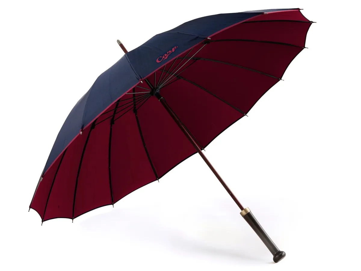 さらに、この傘の生地は、表面が紺色、裏面が赤色の両面織りの特注品。落ち着いた紺色に対して、ジャガード織のカープロゴが上品に映え、シンプルながらも遊び心を取り入れたデザインになっています。生地は山梨県の富士吉田市で丁寧に織られ、細部にまでこだわりが詰まっています。