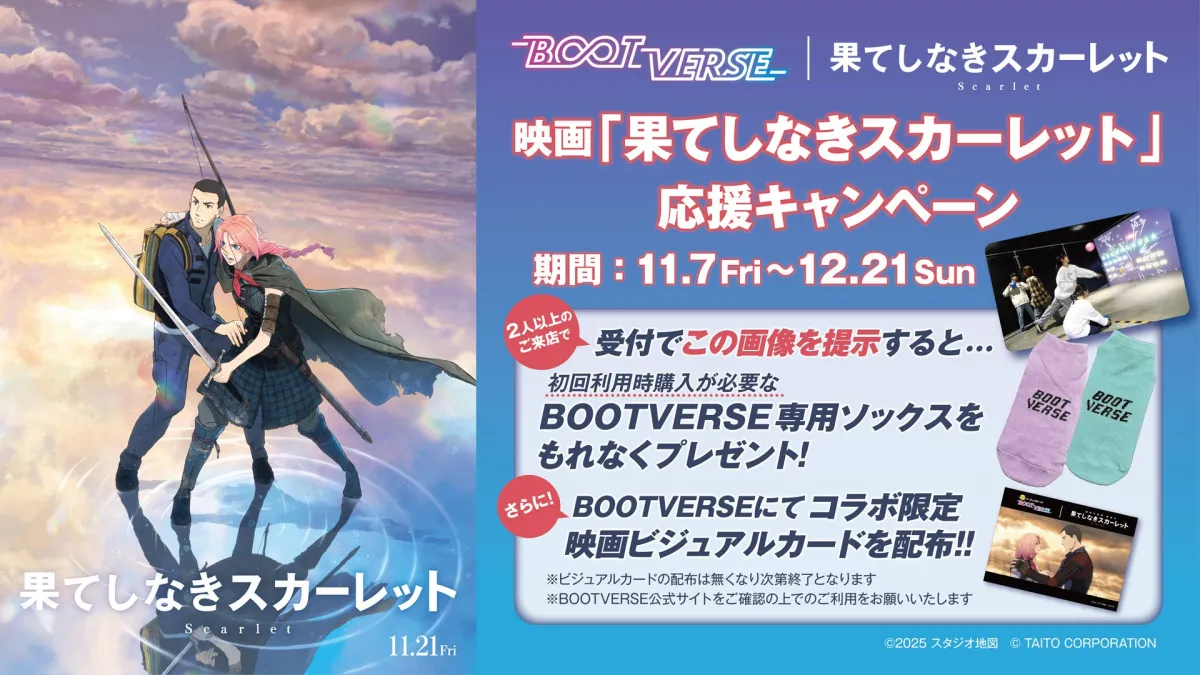 株式会社タイトーが運営するスポーツエンターテインメント施設「BOOTVERSE」は、2025年11月7日(金)から始まる映画『果てしなきスカーレット』の公開を祝して、特別なコラボキャンペーンを開催します。本キャンペーンは、映画に関連した特製グッズや来店特典を通して、より多くのファンに新たな体験を提供することを目的としています。