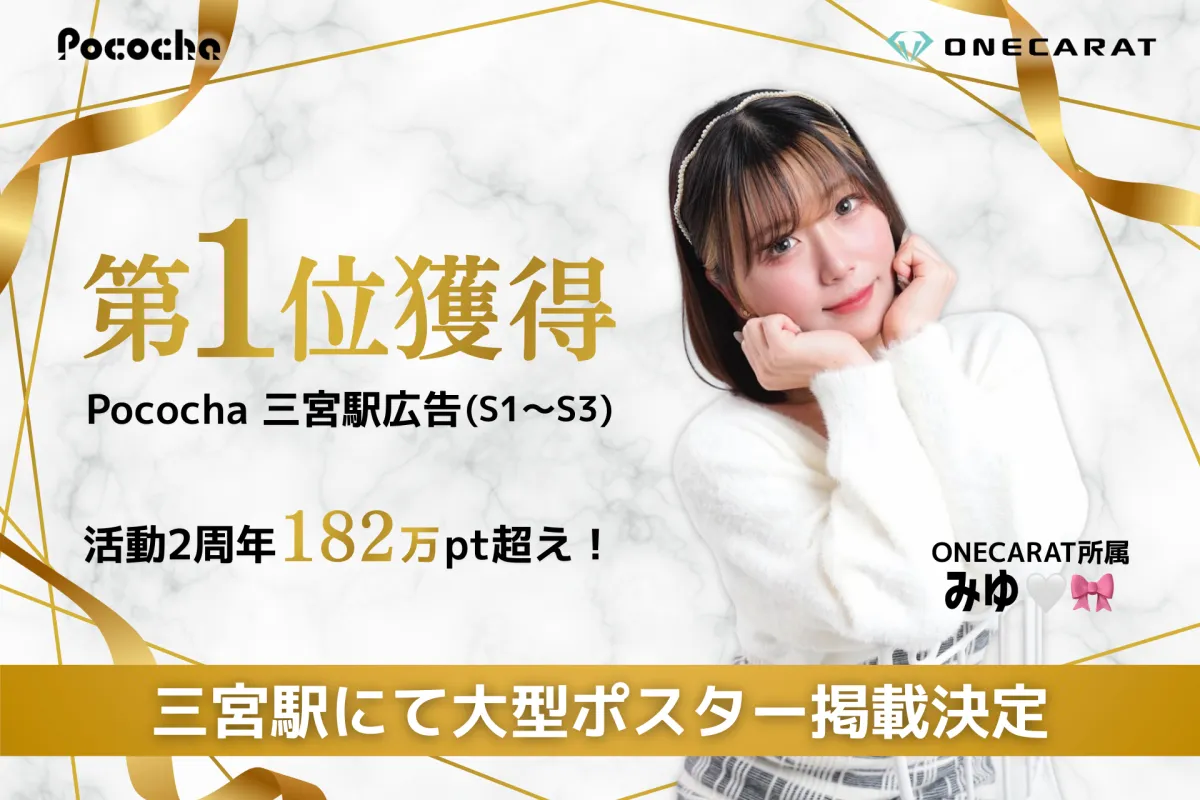 2024年1月24日から30日まで行われた、株式会社AEGIS GROUPが運営するライバー事務所「ONECARAT」に所属するライバー「みゆ🤍🎀」が、ライブ配信アプリ「Pococha」の特別イベント『三宮駅広告』で堂々の第1位を獲得しました。このイベントは、配信実績に基づいて駅構内に掲出される広告掲載の権利を競うもので、みゆは合計1,823,501ポイントを得て、見事に優勝を果たしました。