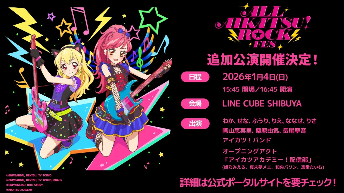 2026年1月4日、LINE CUBE SHIBUYAで「ALL AIKATSU! ROCK FES. MO-IKKAI!!」の公演が行われます。このイベントは、2023年8月に開催された初回公演の追加公演として、さらにパワーアップした内容でお届けされることが決まりました!
