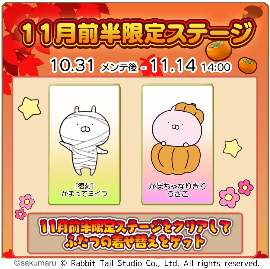 新たに発表された11月前半の限定ステージでは、クリアすることで、復刻版の「かまってミイラ」と新作の「かぼちゃなりきりうさこ」を獲得することが可能です。この両方の着せ替えは、ファンにとって非常に魅力的です。