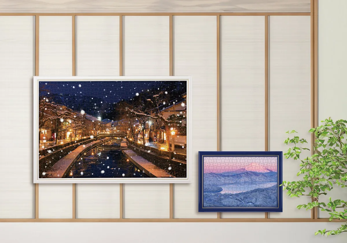今回のジグソーパズルは、そんな日本の冬を代表する名所を二つ選驫れています。一つは、城崎温泉での情緒あふれる冬の風景。もう一つは、箱根大観山から見る雪を冠った富士山の幻想的な光景です。これらの名スポットをパズルで表現し、家で日本の冬を感じることができます。