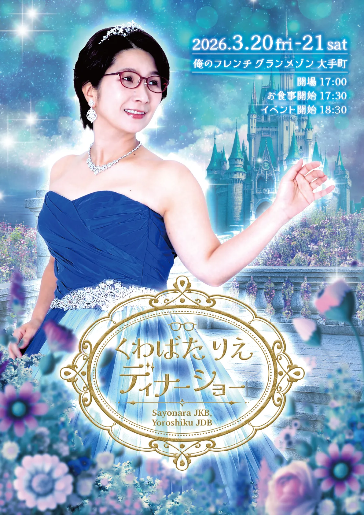 ディナーショーのタイトルは「くわばたりえディナーショー さようならJKB、よろしくJDB」。開催日は2026年3月20日と21日の2日間で、会場は「俺のフレンチ グランメゾン大手町」となっています。営業時間は、開場が17:00、食事開始が17:30、そしてイベントが18:30からスタートします。