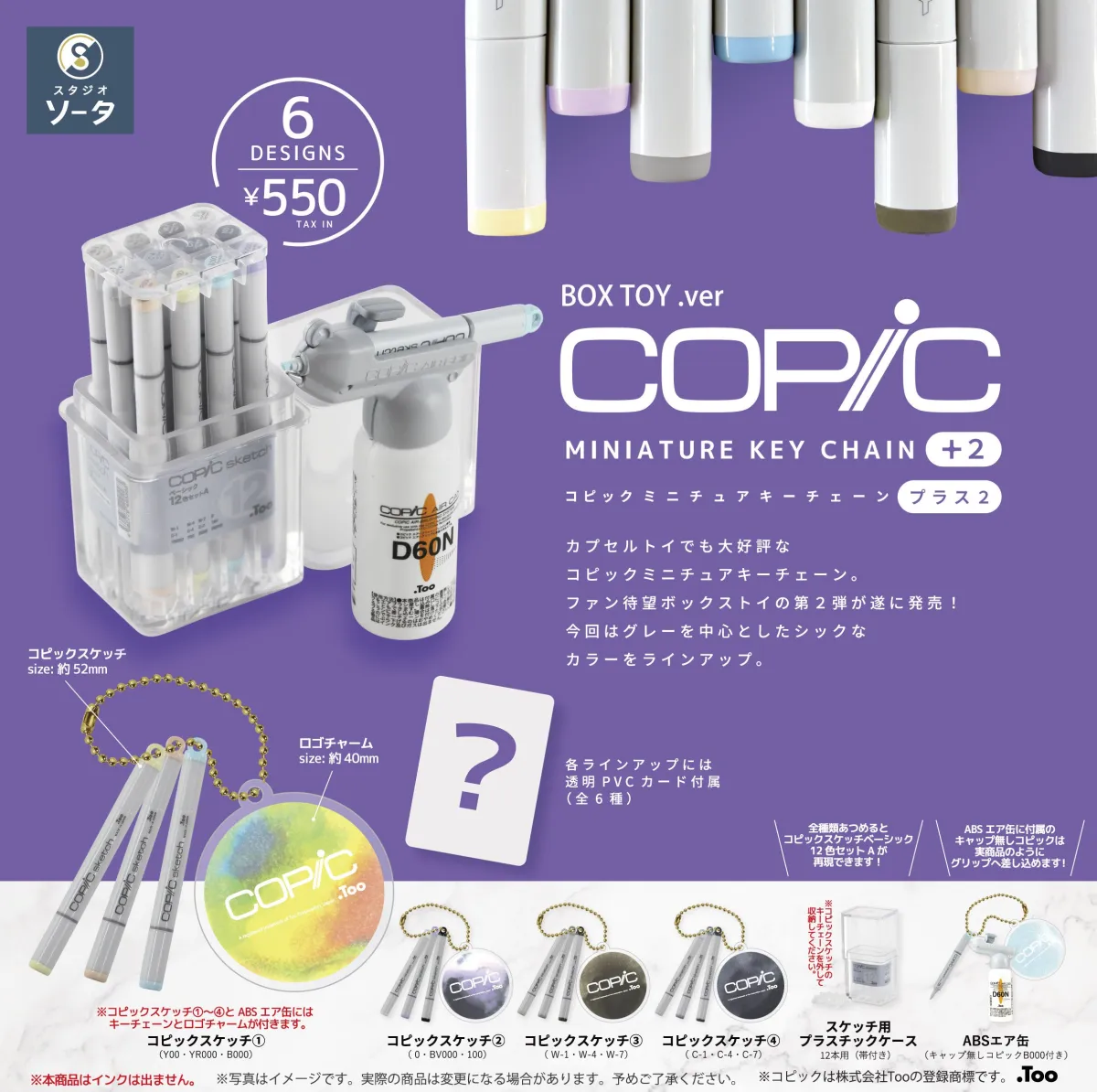 さらに、カプセルトイの新作も同時に展開予定で、「コピックミニチュアキーチェーン3」のシリーズが400円(税込)で、全7種発売されることが決定しています。おなじみの「コピックチャオ」と新商品の「コピックアクレア」が新色で取り揃えられていますので、こちらも見逃せません。