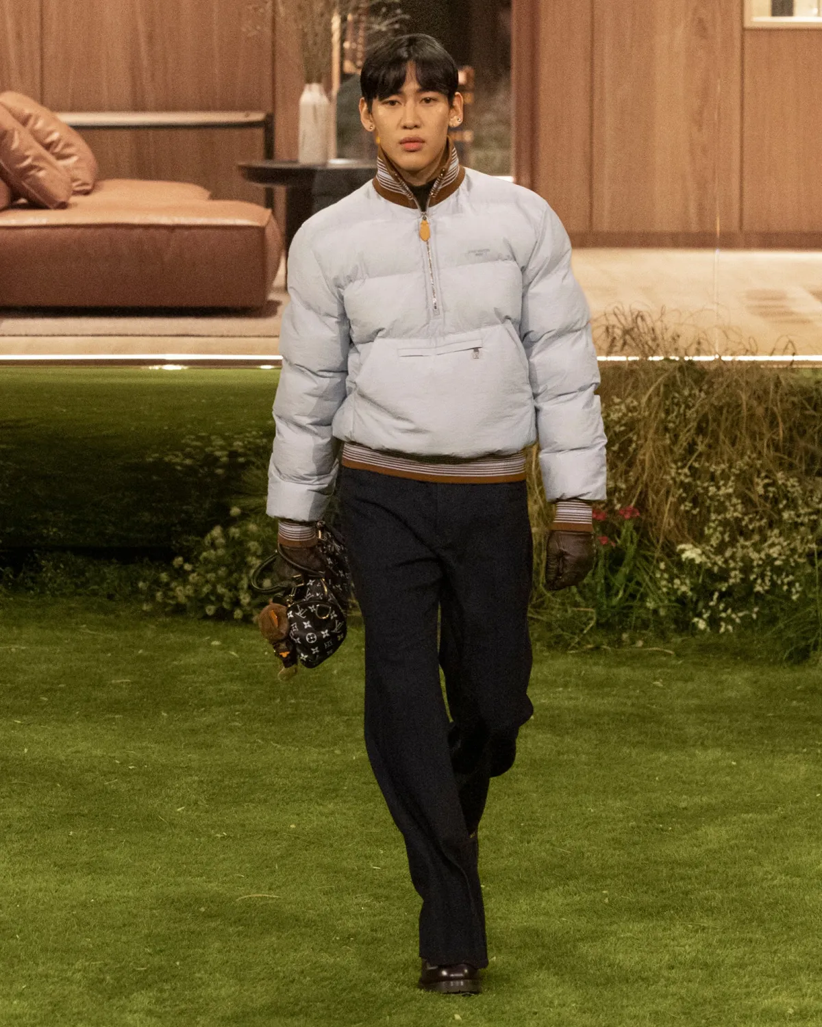 今回のランウェイで特に目を引いたのは、ルイ・ヴィトンのアンバサダーでもあるベンベンの登場です。彼はそのスタイルと存在感で会場を魅了し、モデルとして際立ったパフォーマンスを披露しました。彼の魅力とファッションの融合が、ルイ・ヴィトンの世界観をより引き立てていました。